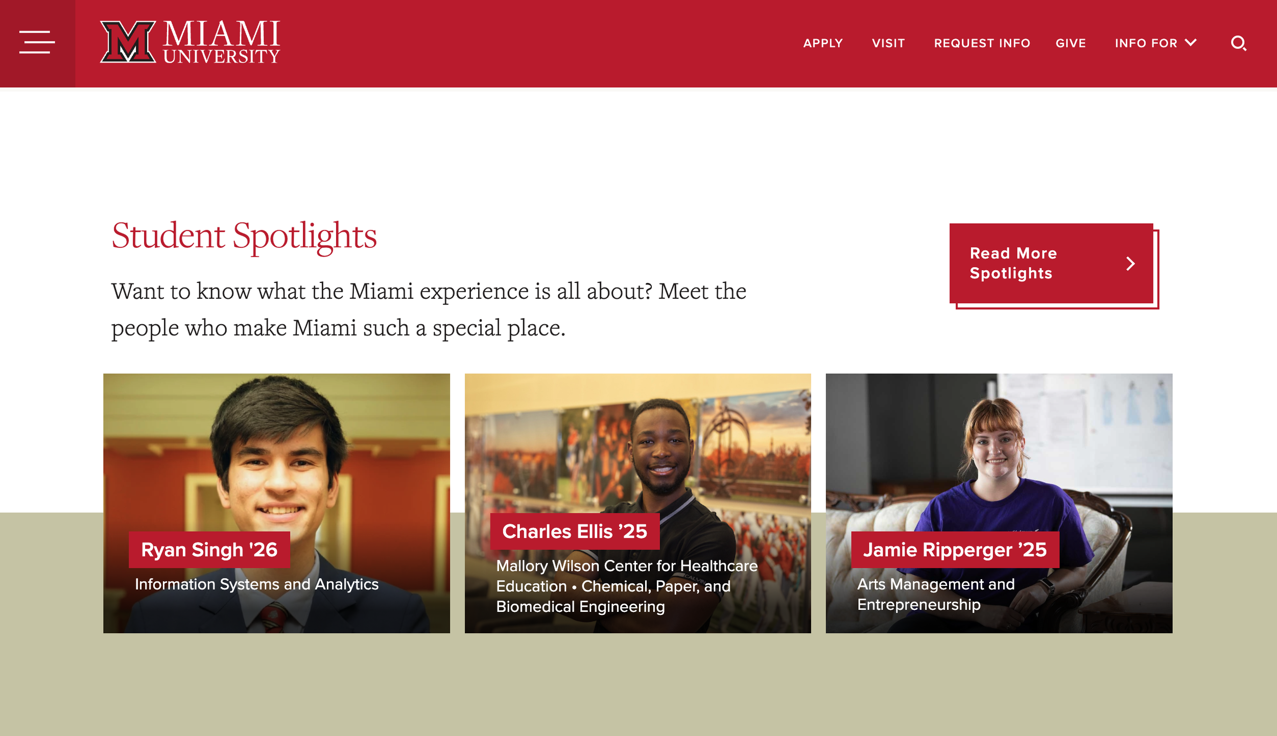 Miami University’s homepage features a “Student Spotlights” section where current and former students share their experiences and what the university has meant for them.
